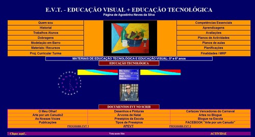 Página da Disciplina de EVT que se atualiza com as novas disciplinas de Educação Visual e Educação Tecnológica.É uma página pessoal que já tem longos anos e foi criada para partilhar conteúdos de EVT. Atualmente tenta adaptar-se à nova realidade.