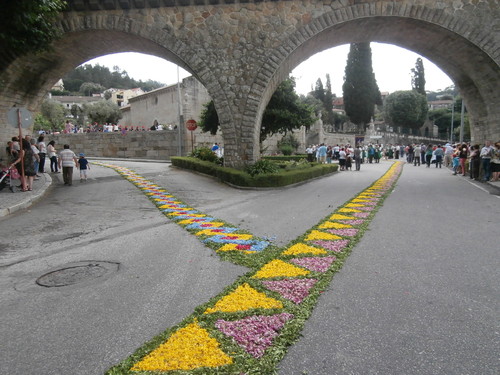 Hoje, dia do Corpo de Deus, depois de acompanhar o meu afilhado Diogo na Profissão de Fé em Lobão da Beira, pela tarde, fui até Vouzela apreciar as lindas passadeiras de flores que os habitantes daquela cidade todos os anos fazem. Quando posso vou sempre ver a beleza desta passadeira de flores feita pelos habitantes para a procissão do Corpo de Deus. Por onde passa procissão, cada morador está incumbido de fazer à sua porta parte da passadeira de flores que se estende por largas dezenas de metros ao longo da Cidade e sempre unida sem qualquer interrupção. Cada morador tem à sua mercê a criatividade e originalidade na apresentação da sua parte e chega a arranjar flores dum ano para o outro, congela-as, para poderem estar frescas nesta altura do Corpo de Deus. É das coisas mais belas que se fazem neste país e é um gosto que eu todos os anos tenho ao ir ver esta magnifica passadeira de flores cheia de cores.